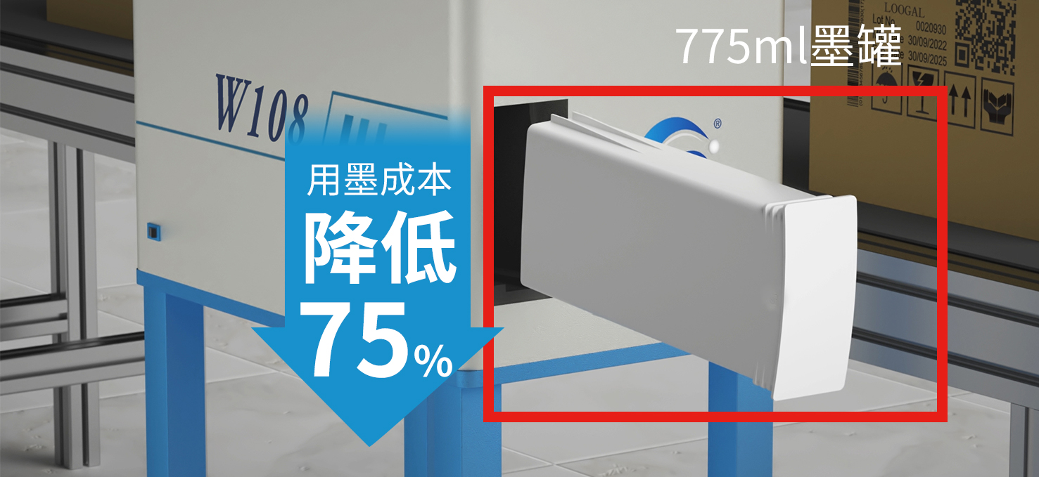 W108噴碼機配備775ml大墨盒,可以有效降低了用墨成本,幫助用戶實現成本控制。